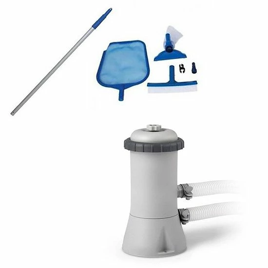 Keep your pool water looking crystal clear with this Intex Krystal Clear Pool Replacement Cartridge Filter Pump and Maintenance Kit.Just relax in your pool, and let the Intex 530 GPH Filter Pump take care of the filtration. Designed for all 8-foot, 10-foot, and 12-foot Intex Above Ground Pools, it’s also great for Sand n Sun, Aqua Leisure and other pools with 1.25-inch diameter hose connections. The GFCI (ground fault circuit interrupter) feature on the 530 GPH pump provides additional safety and protection. Your pump will shut off automatically if the electrical current is exposed to water. Please note, the previous Intex model 58603E does not include this additional feature.Including 3 essentials, the Intex Pool Maintenance Kit helps keeps your pool water looking crystal clear. Maintenance is a part of every swimming pool and getting the right tools for the job cuts down on time spent cleaning. Attach the vacuum to the 94-inch telescoping pole. Simply connect your garden hose and suck debris into the reusable debris bag. Then attach the surface skimmer to the pole and collect leaves and other floating particles.
