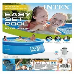 Ideal for hours of refreshing fun with friends and family, the **Intex 10′ x 30 Easy Set Pool Combo** is ready to go in as little as 10 minutes! With a super easy set up and no tools needed your backyard will become an oasis in an instant. Please Note: Proper installation of any above ground pool requires an area, sufficiently larger than the desired pool, to be leveled flat. Uneven ground, hills or holes must be leveled before pool assembly begins. If severely uneven ground prohibits level ground, proper installation will not be possible.