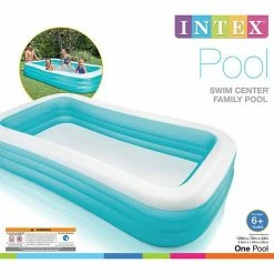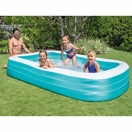 Splash away the summer heat in your own backyard with this Family Inflatable Pool from Intex. The blow-up pool showcases comfortable, wide side walls that allow for ultimate playing and lounging, while the quick setup and convenient drain plug make for easy assembly. So, grab your floaties and suits for an unforgettable summer backyard experience with your family and friends!