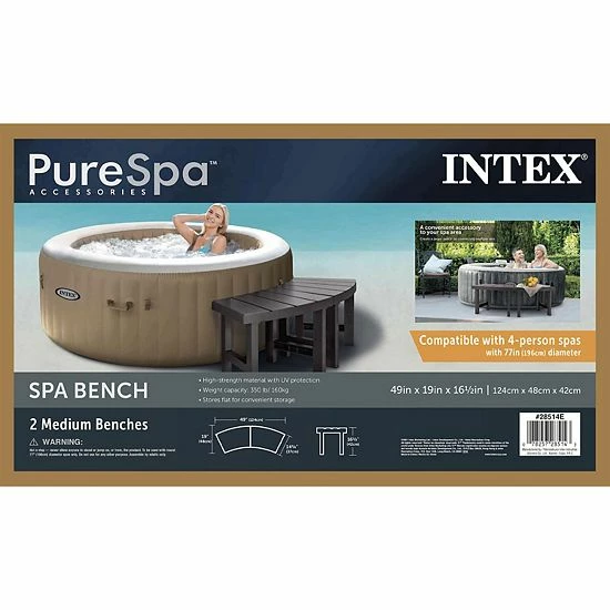 Add convenient storage or lounge area to your Intex PureSpa with this set of 2 Accessory Benches.Compatible with 4 person spas, these benches can be combined to create a larger bench and provide wrap around seating or a flat surface for towels, snacks and drinks, or your guests. Combine with multiple packages of benches and create the seating and storage that makes your spa the most comfortable spot at your home. 16.5 inch height and 19 inch depth gives these benches a large enough profile for comfort, but not so large that they are cumbersome. Each bench has a weight capacity of 350 pounds, make it durable and sturdy enough to support your items. Please note it is not a step and should not be stood on or jumped from.For convenient storage, these benches store flat. Clean storage with quick and easy set up make these benches the simple accessory that takes your spa to the next level. Add this set of 2 Medium Accessory Benches to your Intex PureSpa setup.