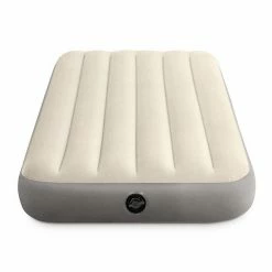 For supreme comfort and amazing durability, look to the Dura-Beam Standard Series Airbed by Intex.The secret is in the Fiber-Tech beam construction, which is comprised of thousands of high-strength polyester fibers that provide enhanced comfort, stability, and support. Each bed is covered in plush flocking that is soft to the touch, and the horizontal air chambers provide added stability and support around the entire bed. And best of all, the airbed is easy to inflate thanks to the built-in, 2-in-1 valve with extra-wide openings, which ensure fast inflating and deflating. This single-height standard series airbed is raised 10 inches from the floor. At 39 x 75 inches, the airbed is an official twin size, making it a good fit for fitted sheets. Whether you’re sleeping at the in-law’s overcrowded house or setting up a guest bed in the basement, the Dura-Beam Standard Series Airbed by Intex is an ideal and comfortable choice for a great night’s sleep.
