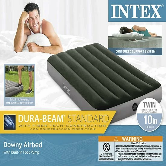 Sleep comfortably and sleep soundly throughout the night by sleeping atop the Intex Dura-Beam Standard Series Downy Airbed with Built-In Foot Pump.This twin-sized airbed mattress is incredibly versatile and can be used in a variety of settings. It’s designed with fiber-tech construction and a velvety sleeping that’ll make it easier to get comfy and doze off to sleep. The extra-wide opening allows for easy inflating/deflating using either an electric or manual pump. Plus, with the inclusion of the built-in foot pump, fast and easy inflation is just within reach. Use this airbed as a routine sleep spot, on vacations, during a sleepover, or while camping.A good night of sleep is worth its weight in gold. Get that good night of sleep you want and need atop the Intex Dura-Beam Standard Series Downy Airbed with Built-In Foot Pump.