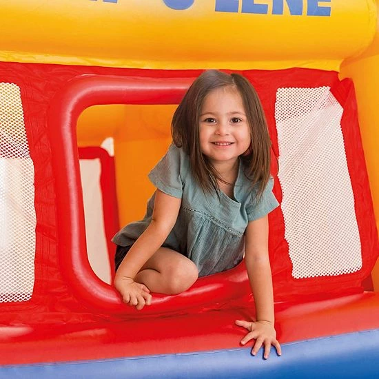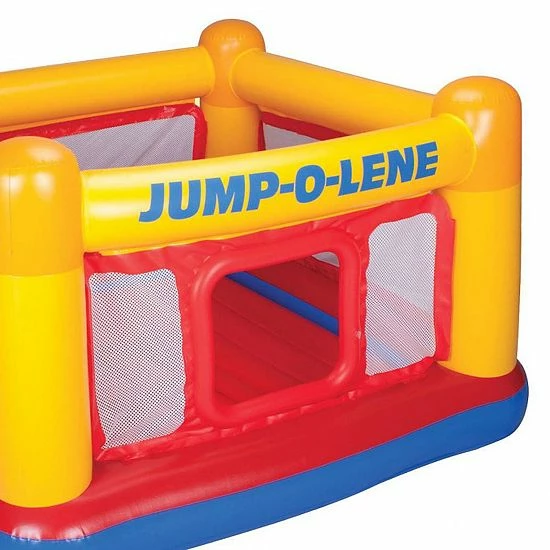 The Intex Inflatable Playhouse Jump-O-Lene encourages physical development, balance, coordination and healthy exercise. Featuring high walls and a soft inflatable floor, this bouncer is safe and fun. This colorful bouncer comes equipped with a crawl-thru door for kids to easily crawl inside.Please note: Stretching is a natural characteristic of new vinyl. During initial use, the bouncer may become soft and require additional inflation to maintain desired firmness. This is normal for the first few days of use.This package will also include an Intex 120V Quick Fill AC Electric Air Pump with 3 Nozzles