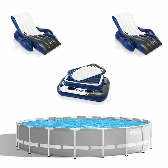The Intex Prism Frame Pool is perfect for hosting all those backyard pool parties this summer. The upscale gray pool comes with a cartridge filter pump and instructional DVD that helps you get the pool up and ready for water in just 45 minutes!Prism frame pools are enhanced with strong, powder-coated steel tubing. They’re durable and still easy to assemble. The liner is stylish and constructed with puncture-resistant, 3-ply material for years of backyard fun.This package includes 2 Intex Floating Recliner Loungers with Cup Holders. You can put the cup holders to good use with the included Intex Inflatable Mega Chill II Beverage Cooler Float. Start your summer off with a stylish above ground pool with the Intex Prism Frame Pool, Inflatable Loungers, and Mega Chill Cooler.