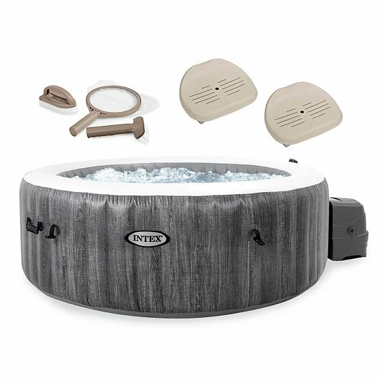 Let your worries bubble away as you unwind in the Intex PureSpa Plus Inflatable Hot Tub with Maintenance Kit and 2 Seats.This bundle comes with a hot tub, maintenance kit, and 2 seats. The PureSpa provides relaxation at the touch of a button for up to 4 people with its easy-to-use control panel that activates 140 high-powered bubble jets surrounding the interior of the spa for a refreshing massage. Easily operate the pool’s controls from the Intex smartphone app, which lets you schedule the heating cycle and check to see if the filter cartridges need changing. This set also features built-in LED lighting, headrests, and built-in hard water treatment that system stops calcium buildup to keep your spa time comfortable. This maintenance kit works well for all spas and includes a curved brush, durable mesh skimmer for leaves and other debris, and scrubber pad to help remove tough dirt and grime from your inflatable PureSpa. The slip-resistant PureSpa seat allows you to sit comfortably in the spa and gives you added height. It also has a laminated finish to protect against wear and tear. Relax with the Intex Inflatable Hot Tub Jet Spa with Maintenance Kit and 2 Seats.