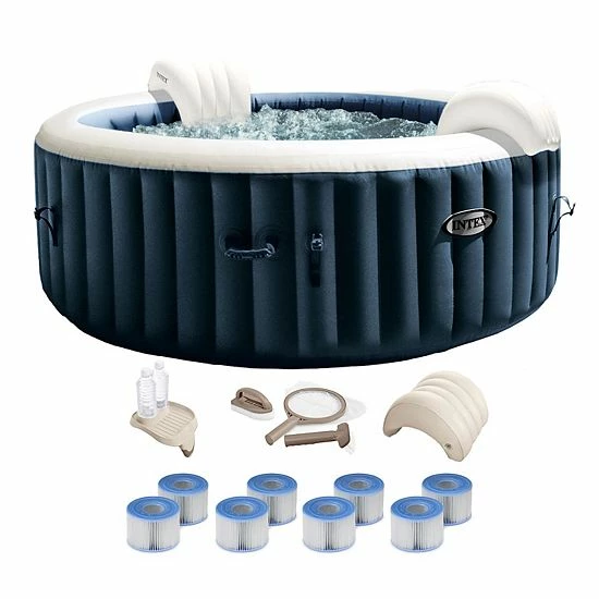 Let your worries bubble away as you unwind in the total relaxation of the Intex PureSpa Plus Inflatable Portable Bubble Jet Spa Hot Tub with Deluxe Bundle.This refreshing spa provides effervescent and luxurious relaxation at the touch of a button for up to 4 people with an easy-to-use control panel that activates 140 high-powered jets. Designed with an adjustable heating system, built-in LED lightings, headrests, and a built-in hard water treatment system, this portable hot tub offers premium comfort and personalized tranquility. Set up is easy and ready for water in just about 20 minutes. Decked out with premium accessories, this deluxe package includes an insulated cover, heating system, filtration system, air blower, hard water system, 1 color-changing LED light, 8 filter cartridges, 3 headrests, 1 slip-resistant inflatable seat pad, 1 refreshment tray, full maintenance kit, a thermal ground cloth, inflation hose, carry bag, floating chlorine dispenser, and test strips.If you’ve always wanted a hot tub without permanently taking up space on your patio, this PureSpa Plus Inflatable Portable Bubble Jet Spa Hot Tub with Deluxe Bundle from Intex is a relaxation game-changer.
