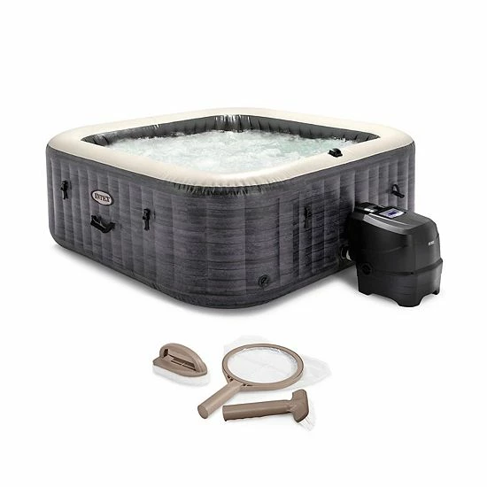 Let your worries bubble away as you unwind in the Intex Pure Spa Plus Inflatable Square Hot Tub Spa with Maintenance Accessory Kit. This inflatable hot tub provides relaxation at the touch of a button for up to 6 people with its easy-to-use wireless, removable control panel. 140 high-powered bubble jets surround the interior of the spa while the heating system adjusts to fit your preferences.1 built-in color-changing LED light, headrests, and a hard water treatment system, make this spa a luxurious experience. The included cover is highly energy efficient and protects the spa from damage. Set up is easy and ready for water in just about 20 minutes. Keep your spa clean and long-lasting for years to come with the maintenance kit that includes a curved brush, mesh skimmer for leaves and other debris, and scrubber pad to help remove tough dirt and grime. Once you get all the debris out from your hot tub, sink back and relax in your luxurious pool once again with ease. Enjoy a clean, pristine, relaxing home spa environment with the Pure Spa Plus Inflatable Square Hot Tub Spa with Maintenance Accessory Kit from Intex.